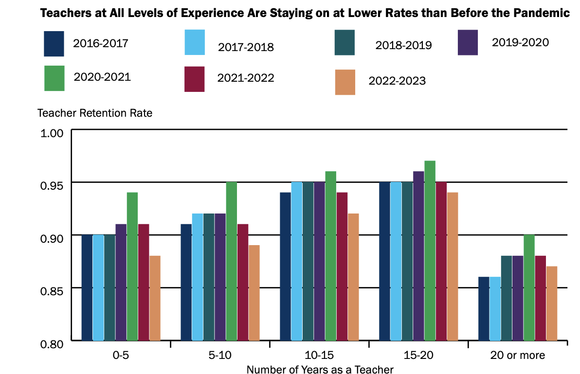 Figure 1. Teacher retention rates in New York City by years of experience, 2016–17 through 2022–23. Source: New York City Independent Budget Office (2023), Recent Trends in Teacher Retention and Hiring in New York City Public Schools