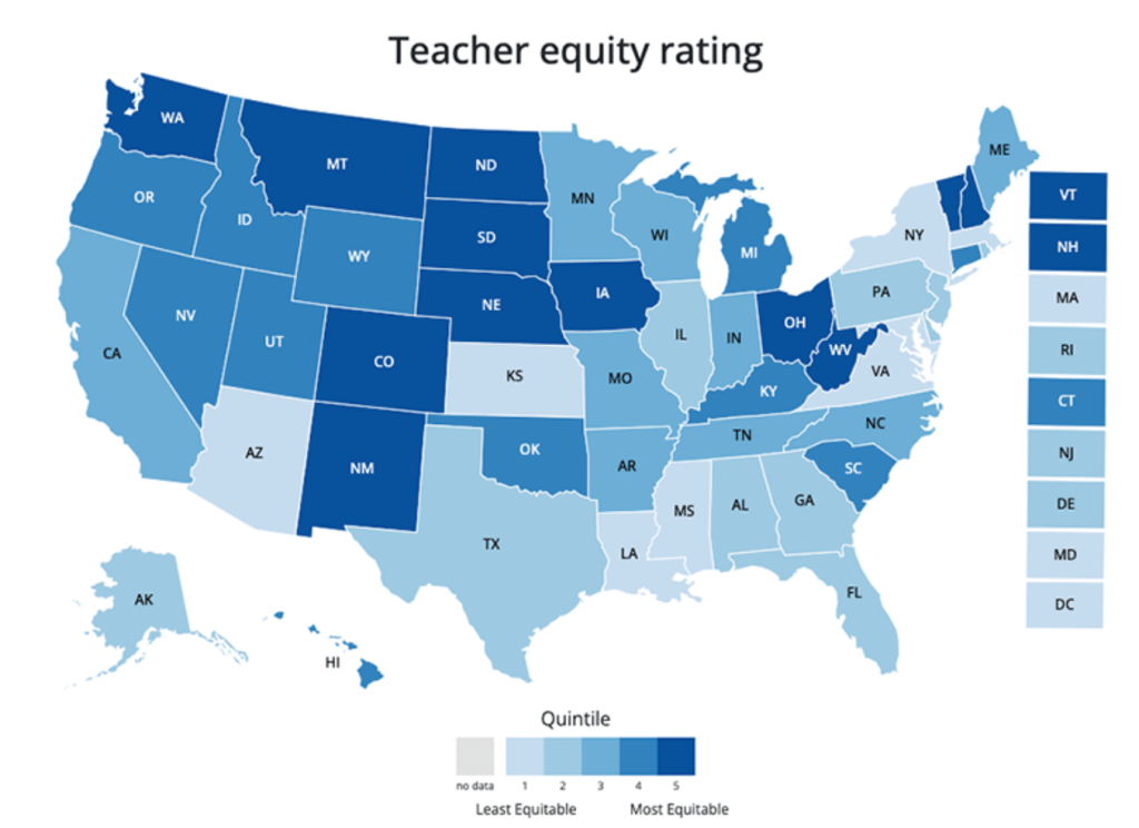 Figure 4: Teacher Equity Rating Across the United States, measuring the equitable distribution of certified and experienced teachers between schools serving high- and low-poverty student populations and high- and low-minority student populations (Learning Policy Institute, 2023)