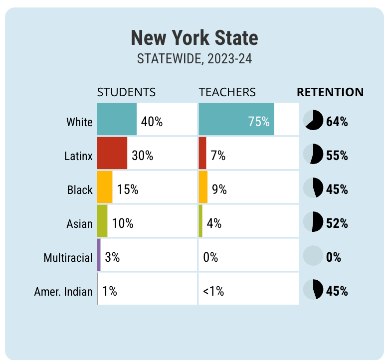 Figure 2: Shares of students and teachers by racial/ethnic groups are reported using data for the 2023-24 school year in New York State. 5-year retention rates for teachers cover school year 2019-20 to school year 2023-24. Source: The Education Trust–New York. (2025). Educator diversity tool. The New York Equity Coalition.
