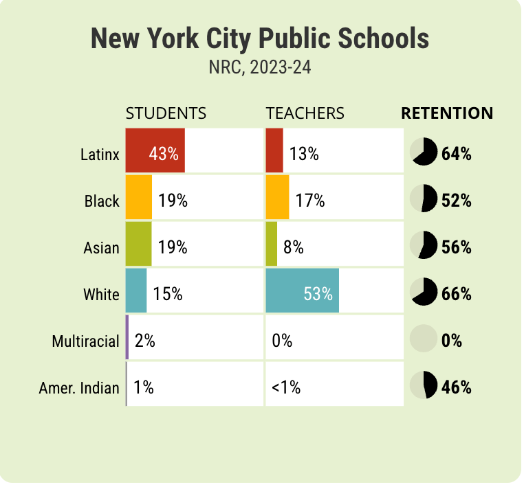 Figure 3: Shares of students and teachers by racial/ethnic groups are reported using data for the 2023-24 school year in New York City. 5-year retention rates for teachers cover school year 2019-20 to school year 2023-24. Source: The Education Trust–New York. (2025). Educator diversity tool. The New York Equity Coalition.