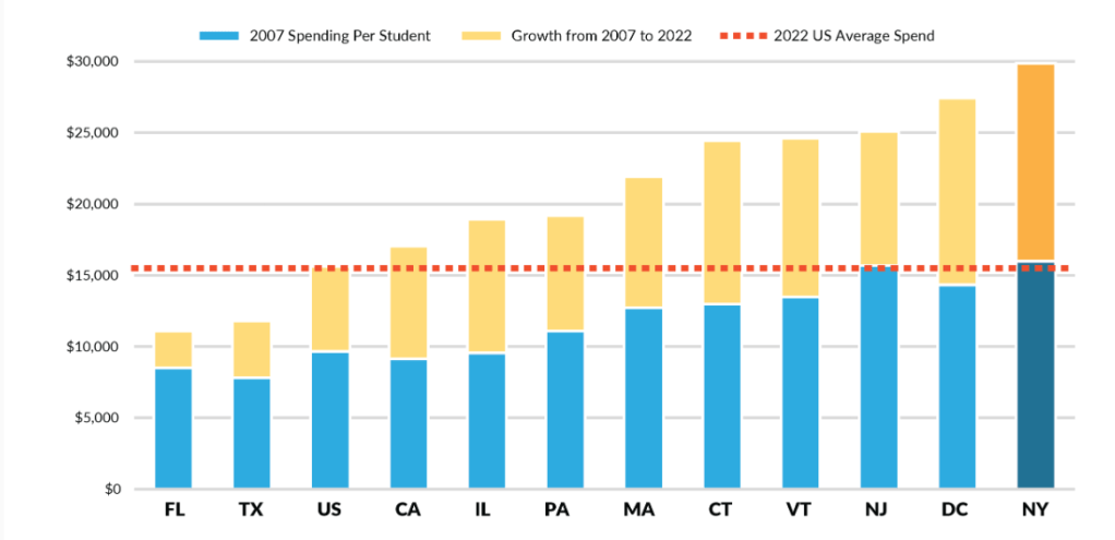 Looking through recent reports, I found Figure 1 from The Citizens Budget Commission earlier this year. This figure shows the change in per-student school spending from 2006–07 to 2021–22 for New York and a group of peer states. As I analyzed this graph, New York’s spending level stands out as an outlier over the last 15 years. By 2021–22, New York spent substantially more per student than every comparison state and nearly double the national average. This gap is not marginal; it reflects tens of billions of dollars in additional annual spending relative to similarly sized states. For example, New York State has nearly 2.4 million students, compared with Florida, which has nearly 3 million. New York State is spending almost 90 billion dollars on education, compared to Florida, which is spending slightly over 30 billion dollars, according to both states’ fiscal budgets.