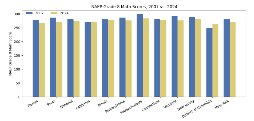 Figure 4. NAEP Grade 8 math scores in 2007 and 2024 for New York and peer states.